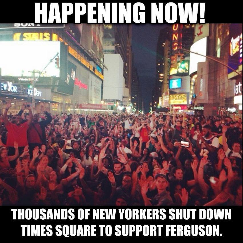 Happening NOW: Thousands of New Yorkers are staging a sit-in in the middle of Times Square chanting, “Hands up, don’t shoot” to support the people of #Ferguson. Every 28 hours in the US, a person of color is killed by racist police terror. Rest in Peace to Mike Brown, Eric Garner, Rekia Boyd, Oscar Grant, Ramarley Graham, Amadou Diallo and too many more.