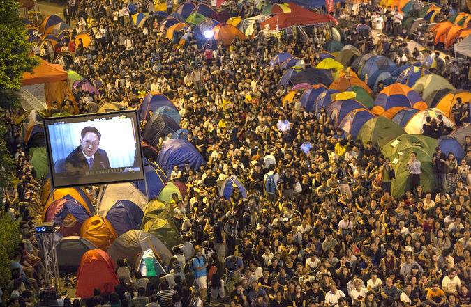 After weeks of protests, Hong Kong residents thought they had seen it all. Then, this Tuesday night, something extraordinary happened, on live television: a debate between students wearing black “Freedom Now” T-shirts and top Hong Kong leaders over the future of democracy. This image captures thousands of Umbrella Movement protesters watching a live broadcast of the debate. Amazing!